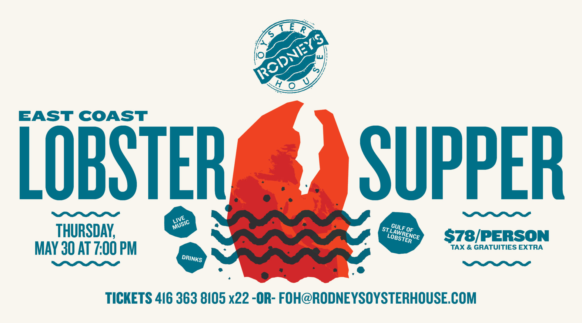 Our annual East Coast Lobster Boil is happening on Thursday, May 30th at 7 pm.  Live music by A Piece of the Rock, Oysters on-the-half shell, Wine by Cave Spring Vineyard and Love Block Vineyard, beer by Steam Whistle, Walter Caesars, P.E.I. Blue Mussels, Whole boiled Lobster from the Gulf of the St. Lawrence, Pie. Tickets are $78 (not including taxes and gratuity). Please give us a ring to book your seats (yes, you have to speak to someone) 416-363-8105 ext. 22.